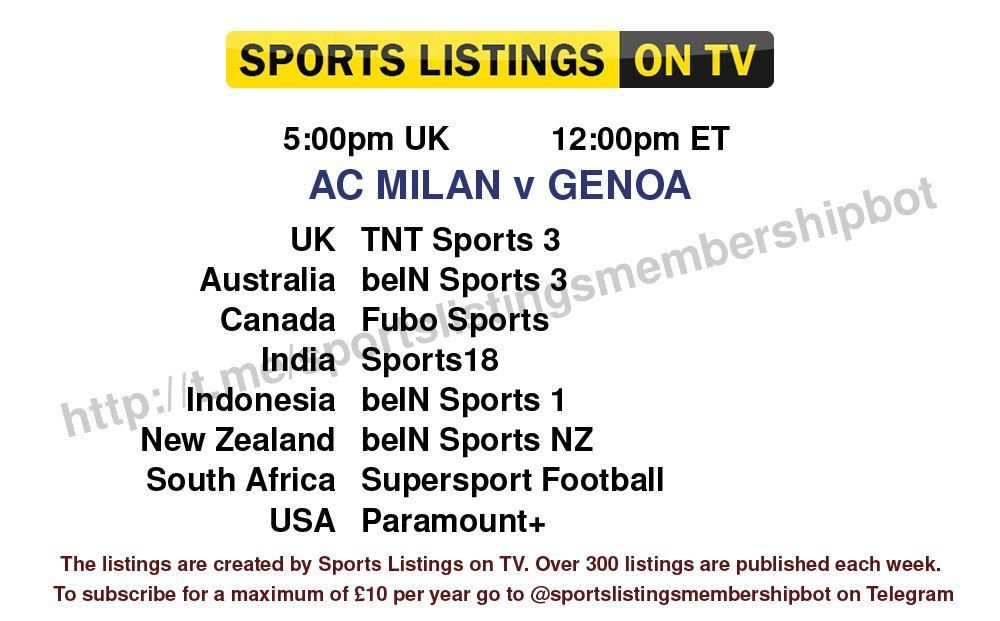 | 17:00 | AC Milan v Genoa | Serie A | TNT Sports 3 |