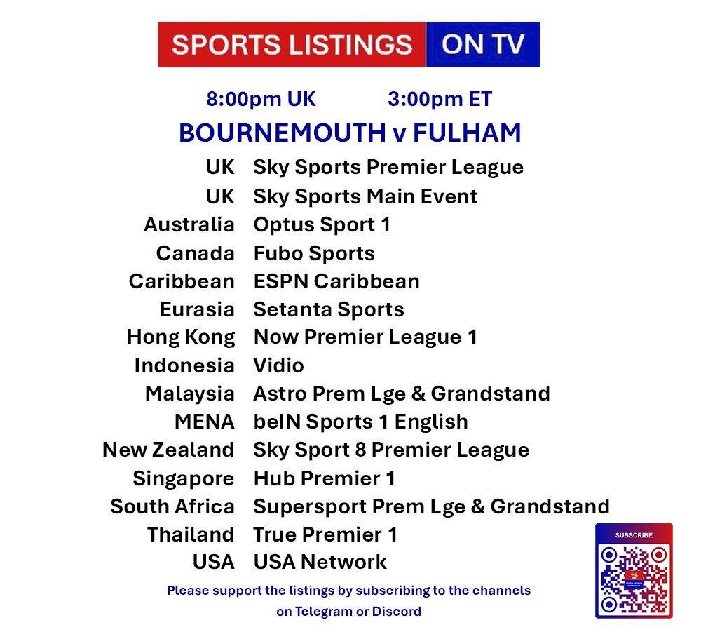 | 20:00 | AFC Bournemouth v Fulham | Premier League | Sky Sports Main Event, Sky Sports Premier League, Sky Sports Ultra HDR |
