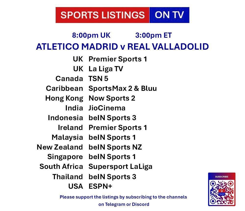 | 20:00 | Atlético Madrid v Real Valladolid | La Liga | Premier Sports 1, LALIGATV |