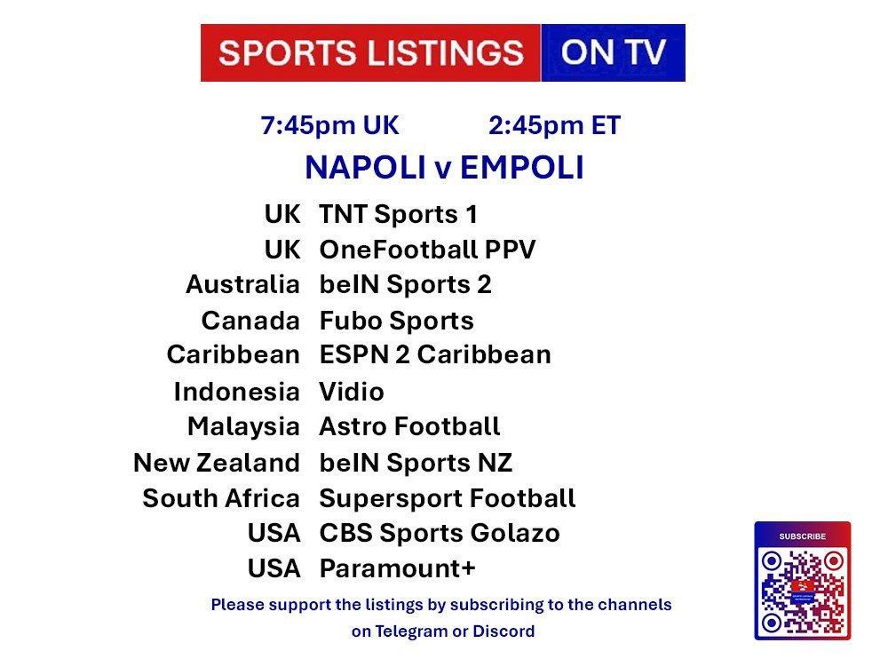 | 19:45 | Napoli v Empoli | Serie A | TNT Sports 1, OneFootball |