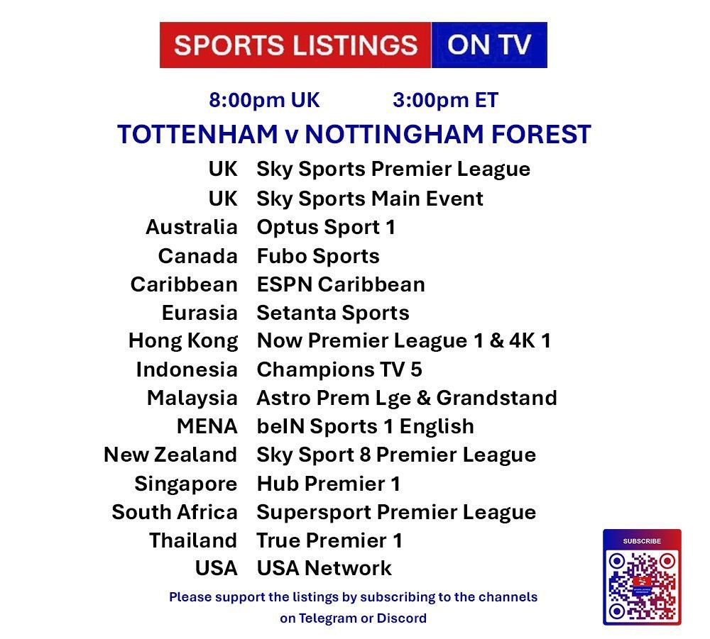 | 20:00 | Tottenham Hotspur v Nottingham Forest | Premier League | Sky Sports Main Event, Sky Sports Premier League, Sky Sports Ultra HDR |