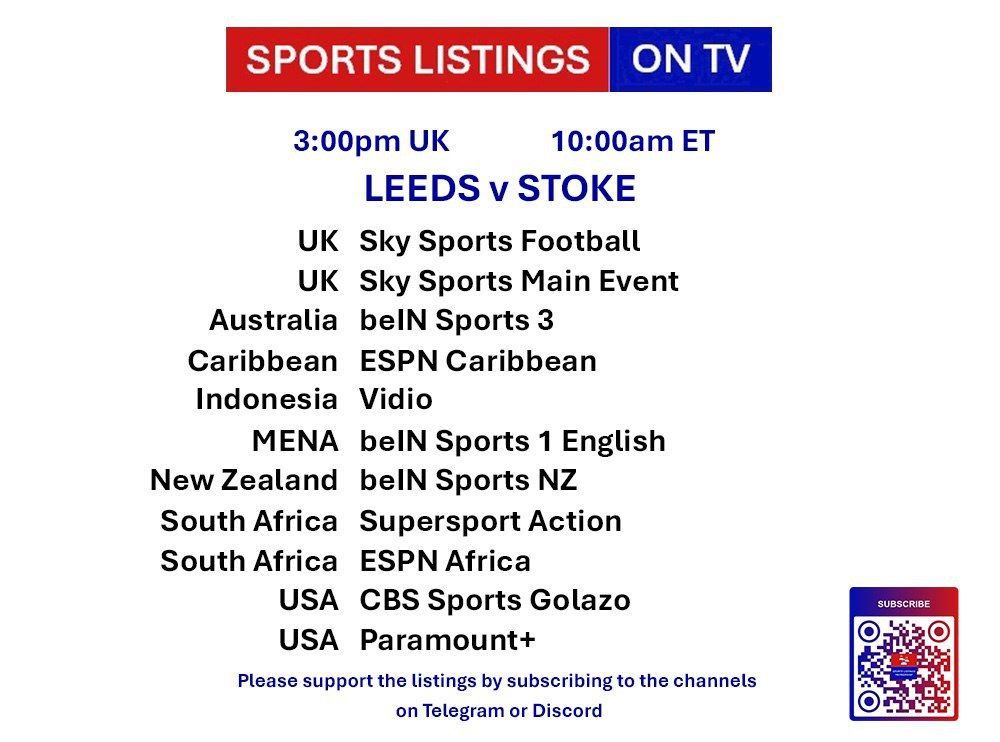 | 15:00 | Leeds United v Stoke City | Championship | Sky Sports Main Event, Sky Sports Football, Sky Sports Ultra HDR |