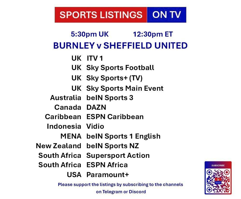 | 17:30 | Burnley v Sheffield United | Championship | ITV1, STV, Sky Sports Main Event, Sky Sports Football, Sky Sports Ultra HDR, ITVX, STV Player |