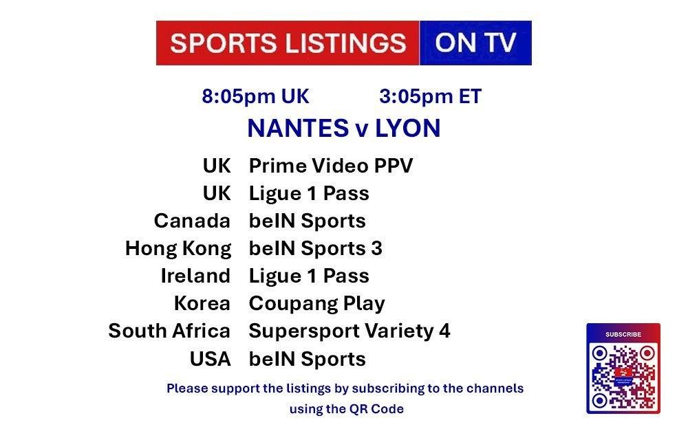 | 20:05 | Nantes v Lyon | Ligue 1 | Amazon Prime PPV, Ligue1+ 📅 |