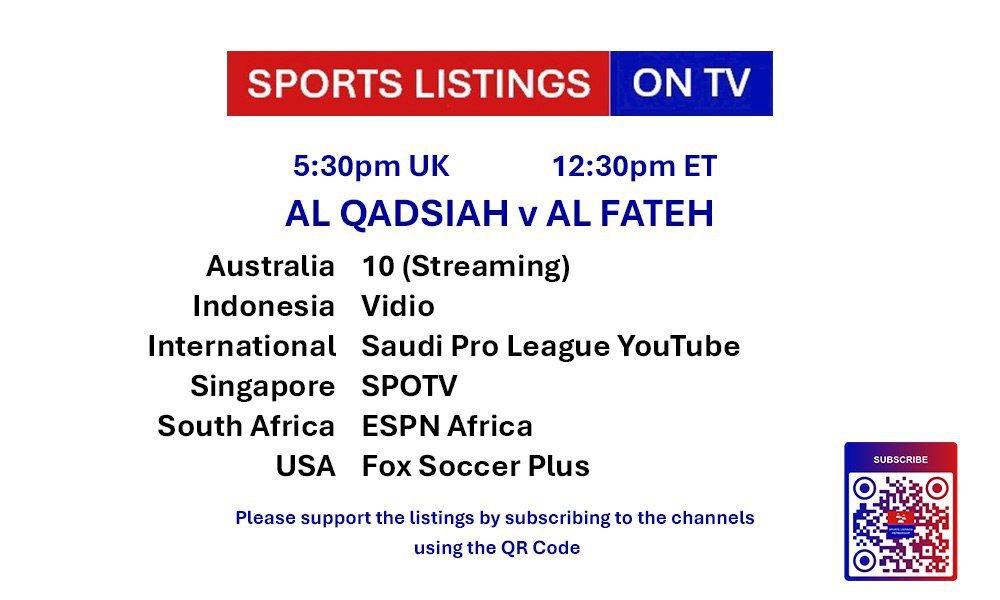 | 17:30 | Al-Qadisiyah v Al Fateh | Saudi Pro League | Saudi Pro League YouTube 📅 |